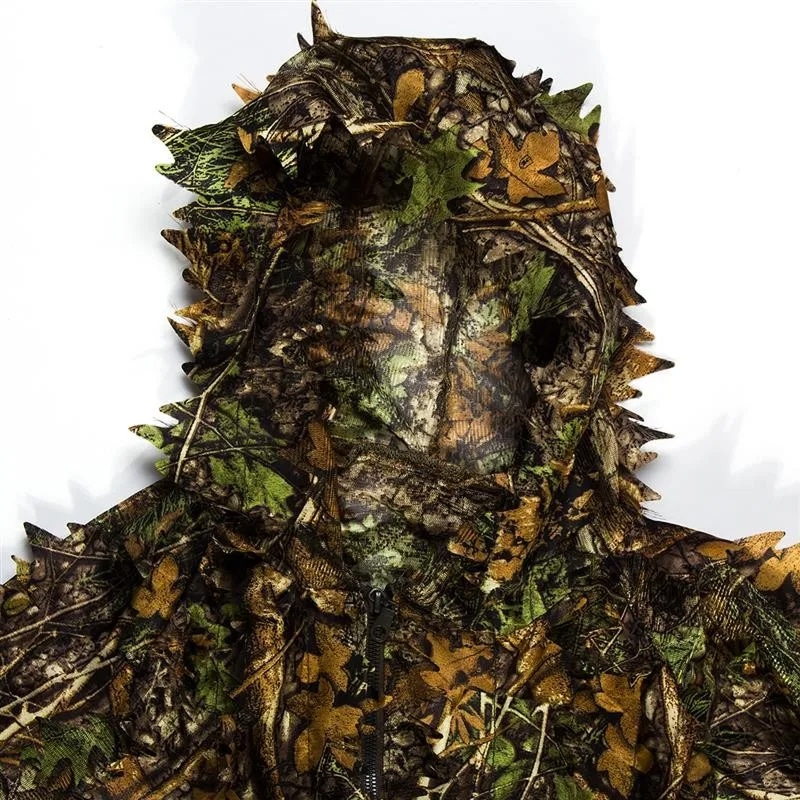 The jungle camo pattern with 3D leaves adapts to woodland, grassland, and mixed terrain effectively. The bionic design mimics natural foliage found in most North American hunting environments, providing excellent concealment.
