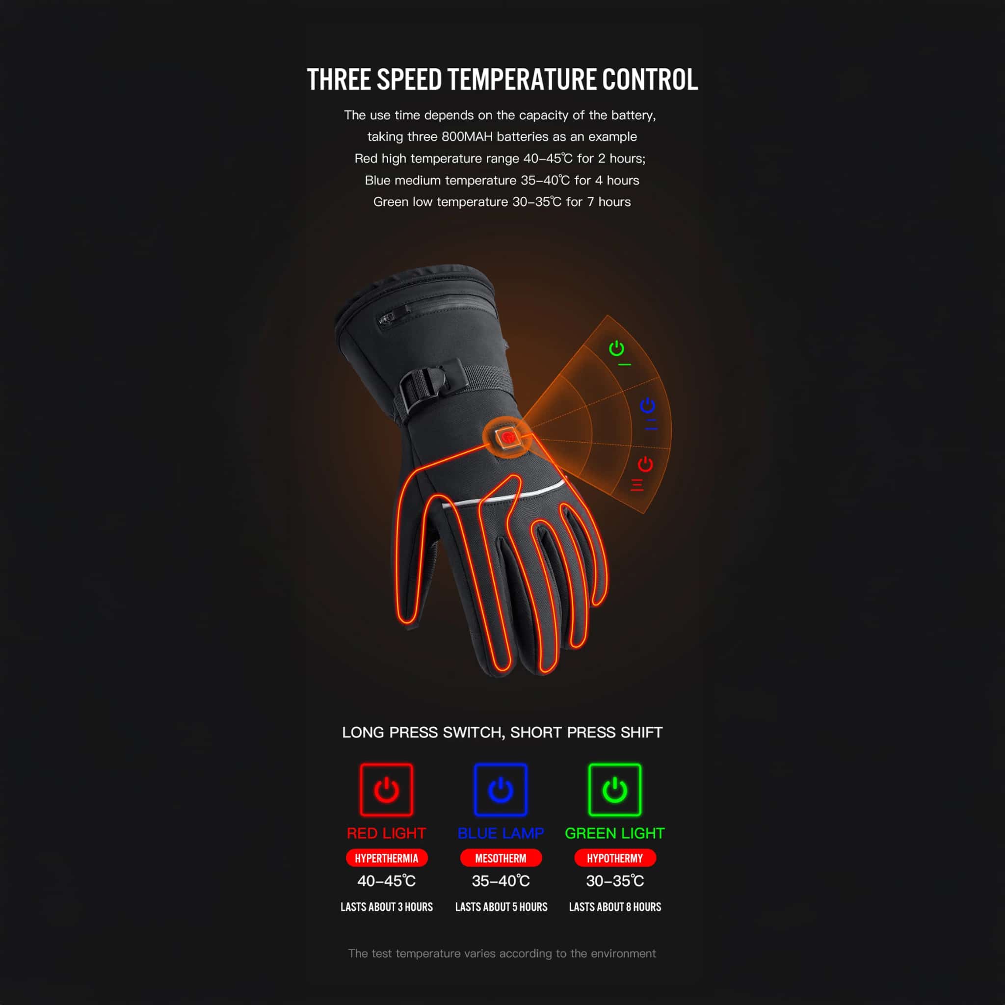 Three modes: low, medium, and high (about 30–45°C). Choose more warmth for intense cold or longer runtime on milder days with BlexiSki Heated Ski Gloves.