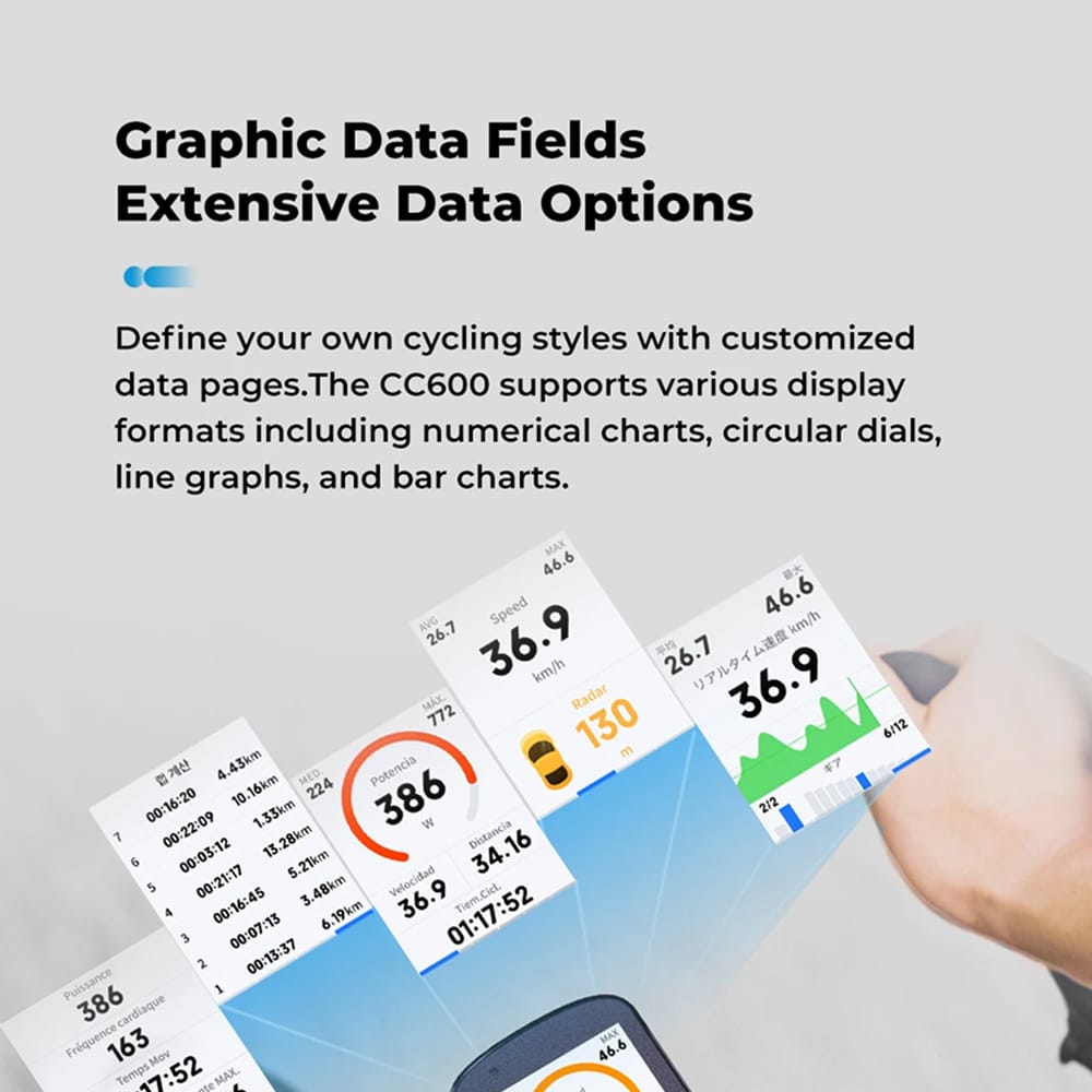 Design up to ten personalised data pages featuring charts, dials, and graphs. Three tactile buttons and durable Asahi-glass construction ensure the Cadnexura Bike Computer remains effortlessly responsive in rain or with gloves.