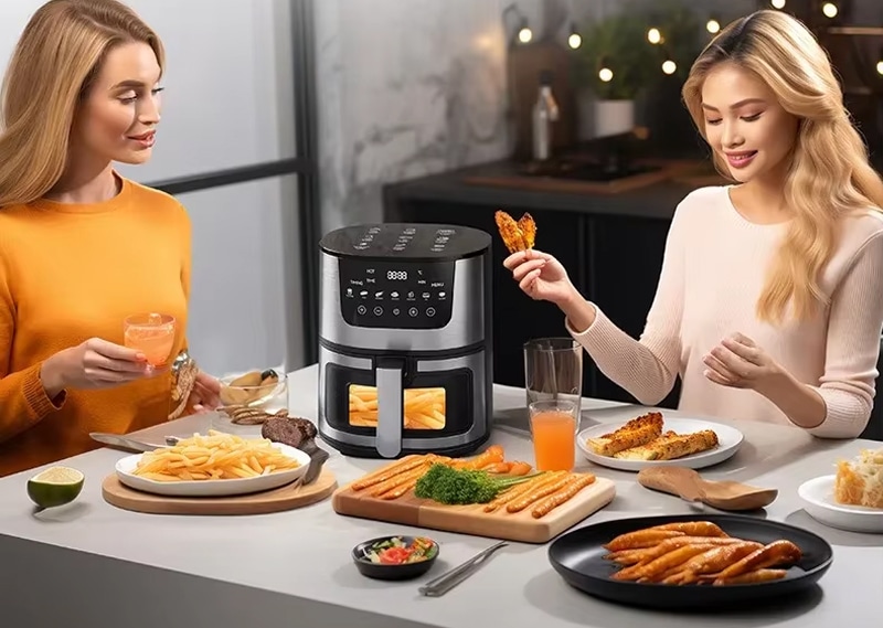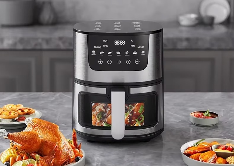The CrispDum Air Fryer’s 7L capacity is perfect for 2-3 people, accommodating up to 800g of fries or a whole chicken for family meals.