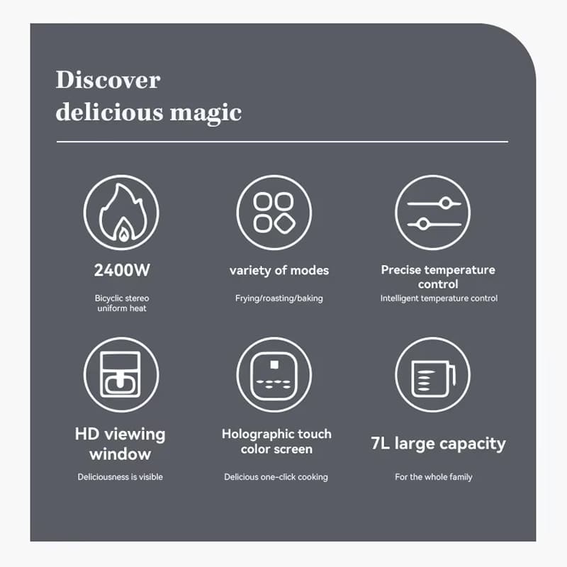 Thanks to its powerful 2400W system, the CrispDum Air Fryer preheats in just 2-3 minutes—much faster than traditional ovens—for quick and efficient cooking.
