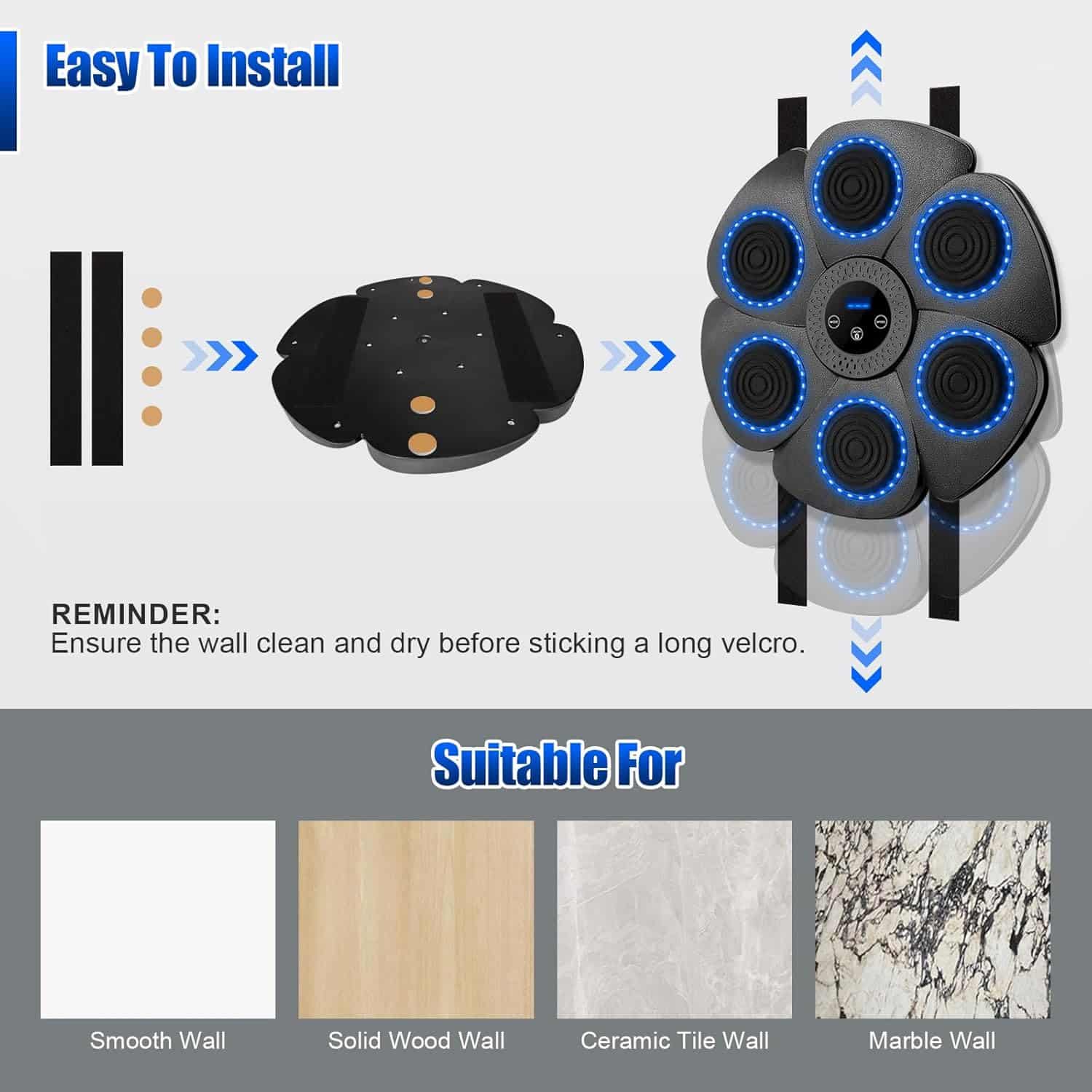 Yes, the FightMuzi Music Boxing Machine comes with strong adhesive strips and nylon buckles for easy and damage-free installation on smooth walls.