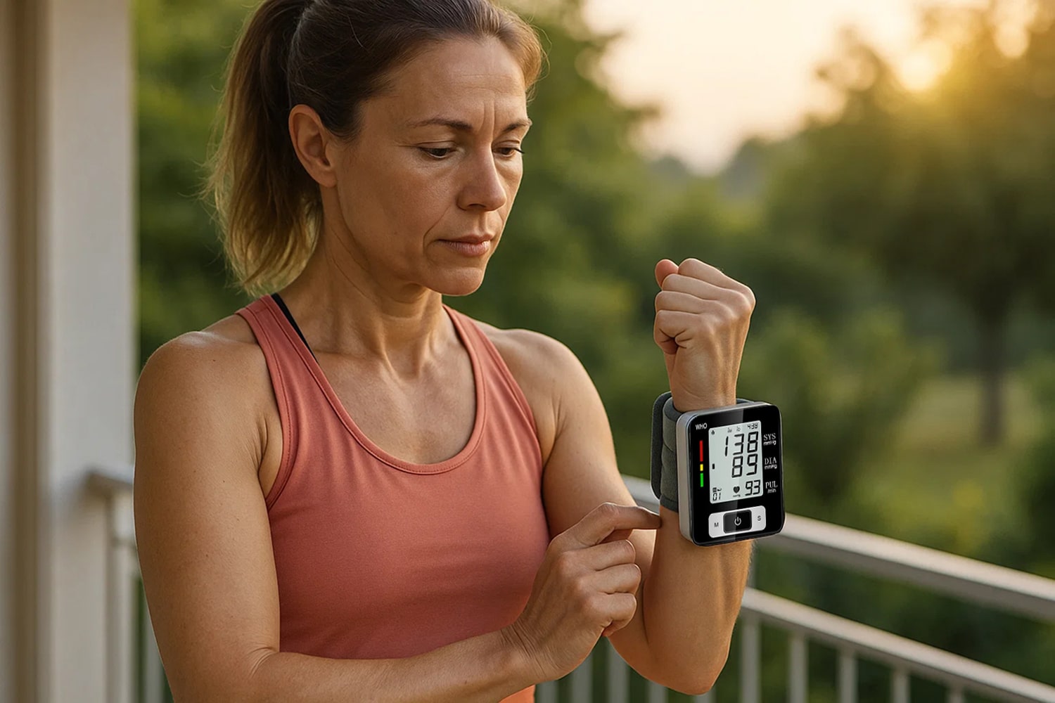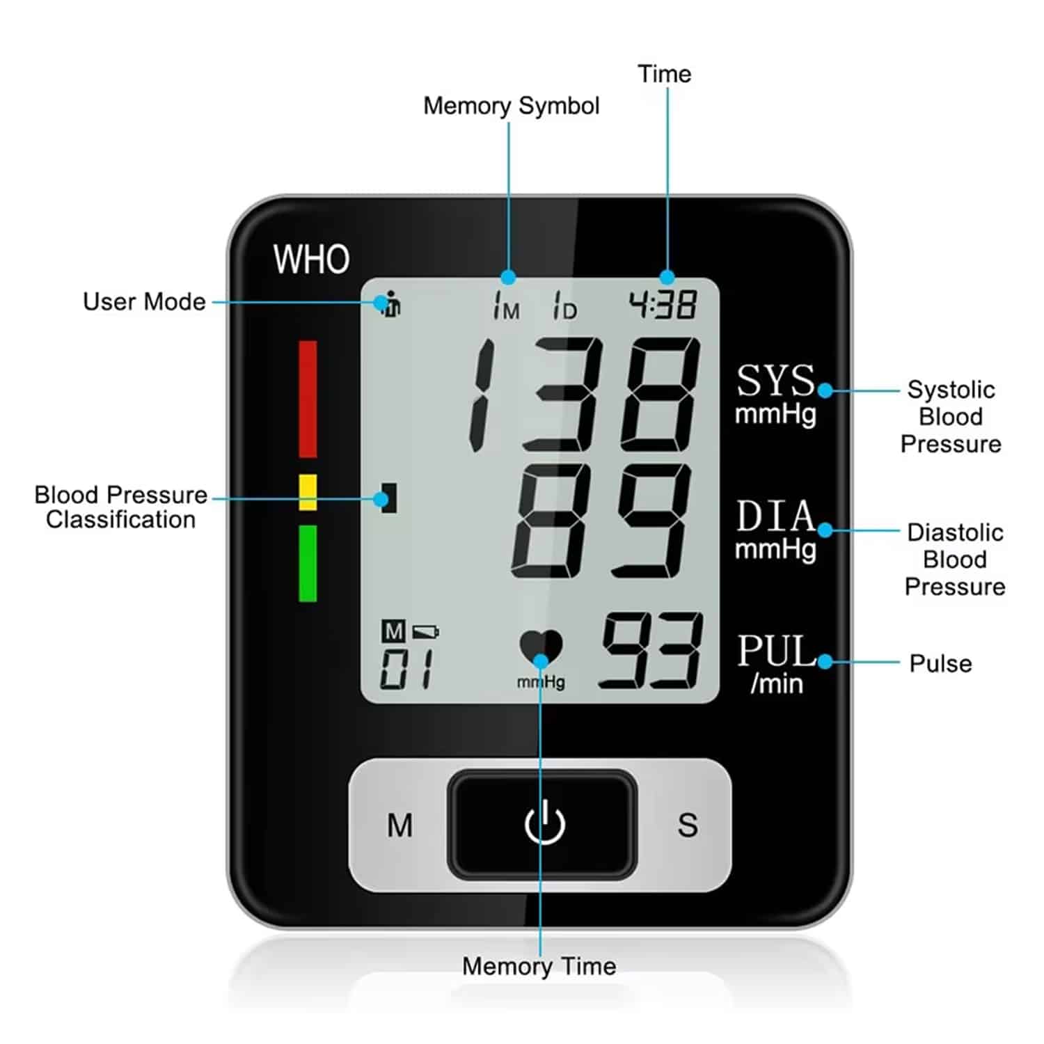 The device includes a WHO classification indicator with intuitive colour coding (red, yellow, green) that instantly shows whether your readings are within healthy ranges or require attention.