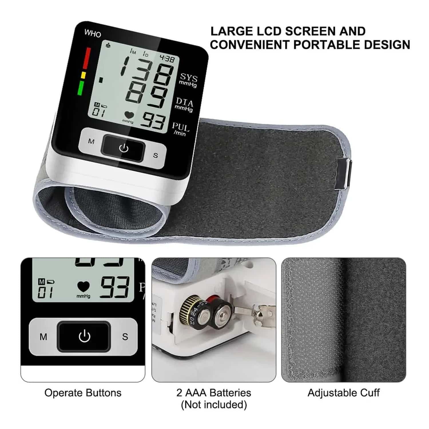 The WrisMoni operates on 2 AAA batteries (sold separately) and features automatic shut-off after 1 minute of inactivity to maximise battery life and reduce replacement frequency.